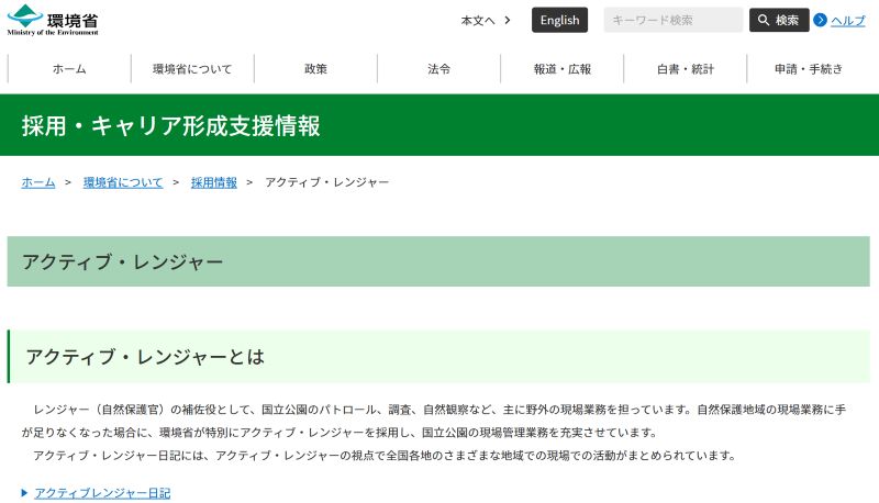 アクティブレンジャーとは環境省の自然保護官(レンジャー)をサポートする非常勤の国家公務員のことです。