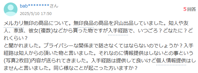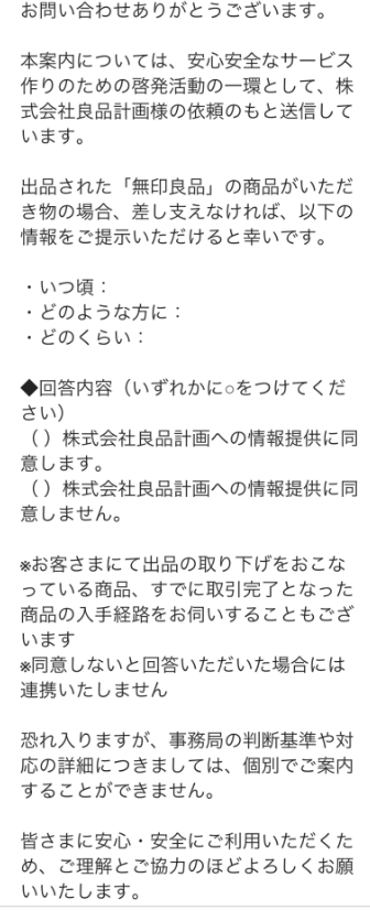 実際にメルカリに無印良品の商品を大量出品していると、情報提供要請のメールがメルカリから届いたという投稿です。