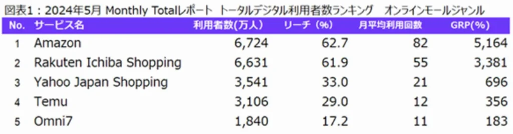 ※ニールセン「ニールセン、デジタルコンテンツ視聴率のMonthly Totalレポートによる オンラインモールジャンルの利用状況を発表」より抜粋