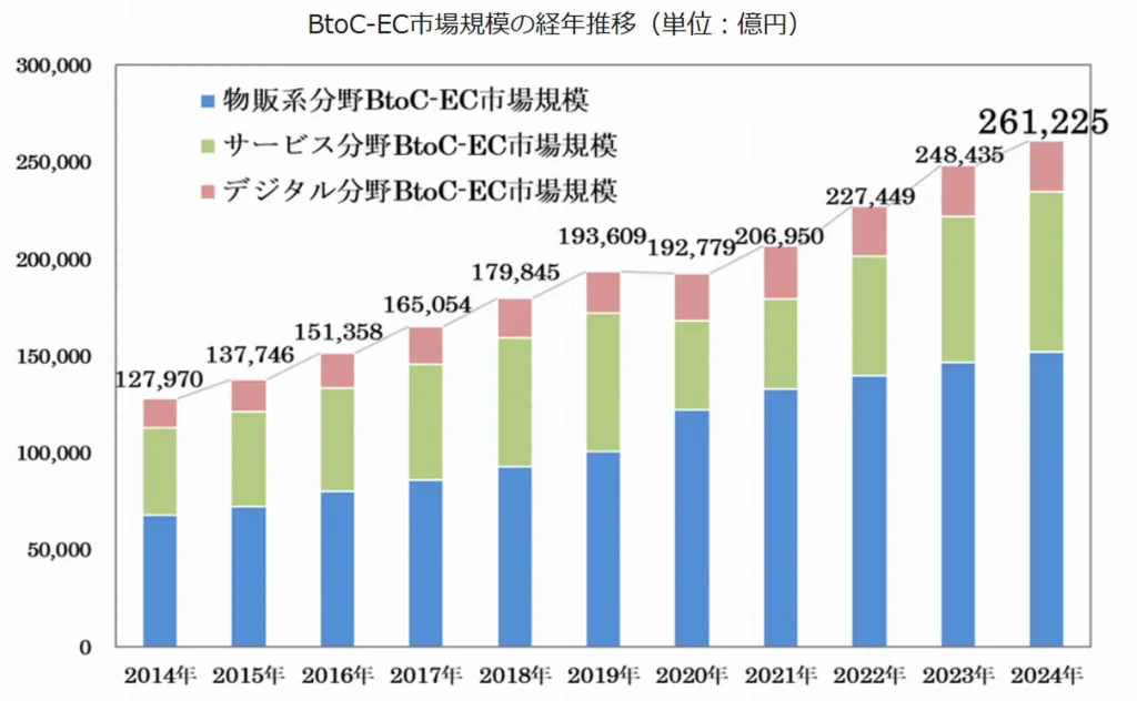 上図の、経済産業省が発表した「令和6年度電子商取引に関する市場調査」によれば、物販系分野のBtoC-EC市場規模は年々右肩上がりで成長し続けています。