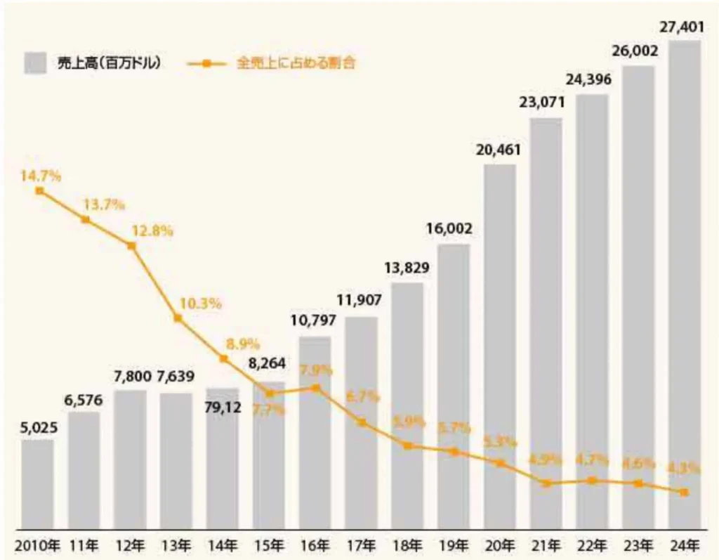 ※impress BUSINESS MEDIA ネットショップ担当者フォーラム「アマゾン日本事業の売上高は約4.1兆円。ドルベースでは274億ドルで5.4%増【Amazonの2024年実績まとめ】」より抜粋