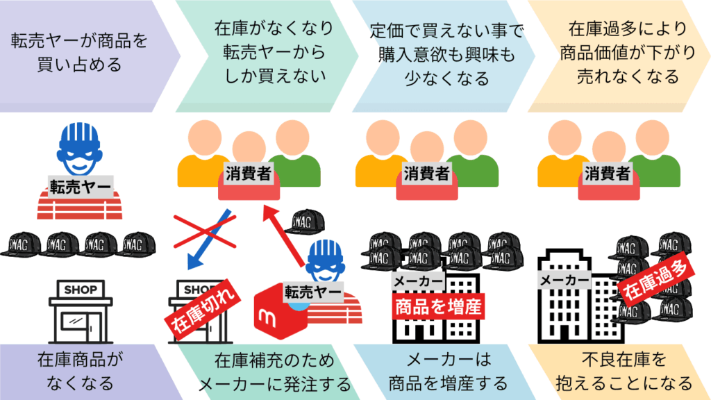 とにかく大損害を受けていることはわかるけど...といった方に、もう少しわかりやすく説明すると、例えば転売ヤーが人気商品の帽子を買い占めた場合...