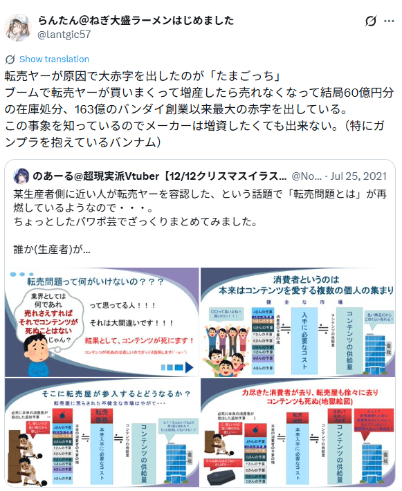 こちらは大手メーカー「バンダイ」が受けた、転売ヤーによる損害をわかりやすく説明している投稿です。