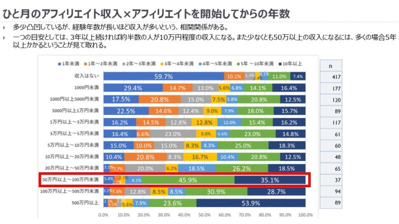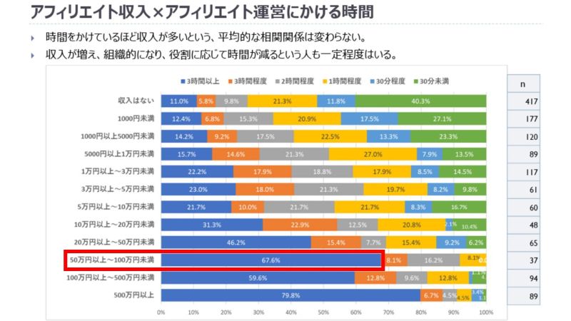 下図のように、ブログアフィリエイトで月50万以上稼ぐ方の約90%は4年以上継続しており、今でも1日3時間以上作業をしている人が7割弱というデータがあります。
